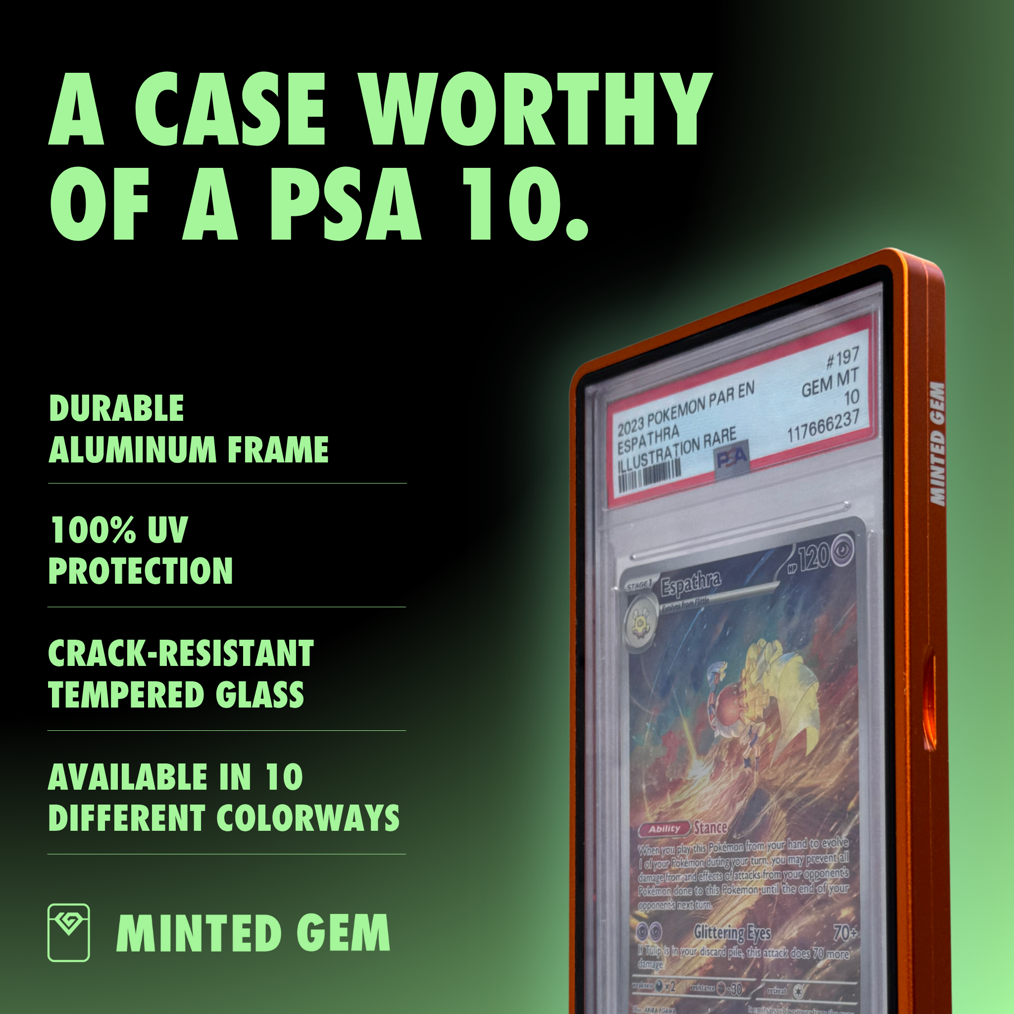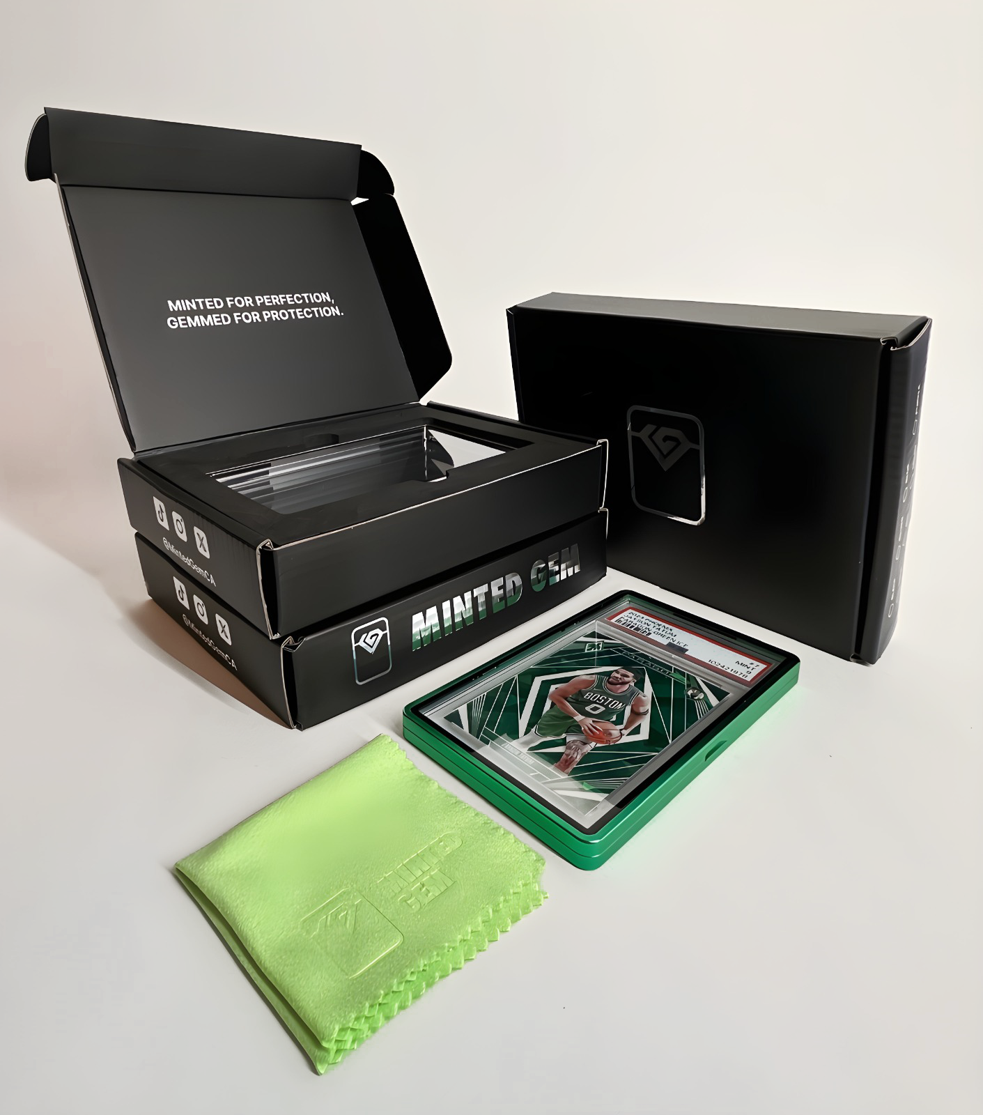 Protect your graded slabs with the Minted Gem ONE. Featuring full slab coverage with tempered glass, 100% UV protection, and a durable aluminum frame, our protector ensures your cards stay safe and showcase-ready.